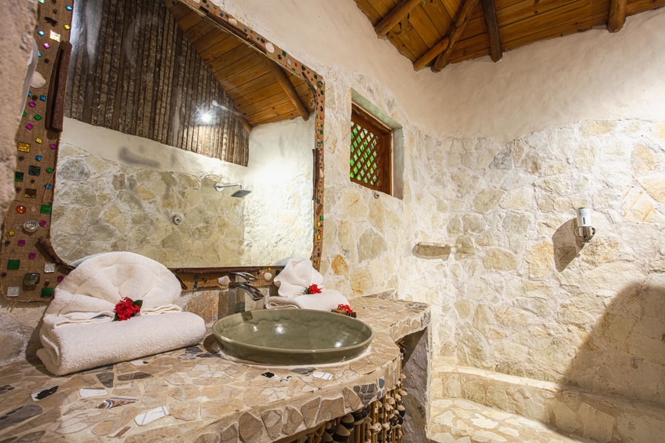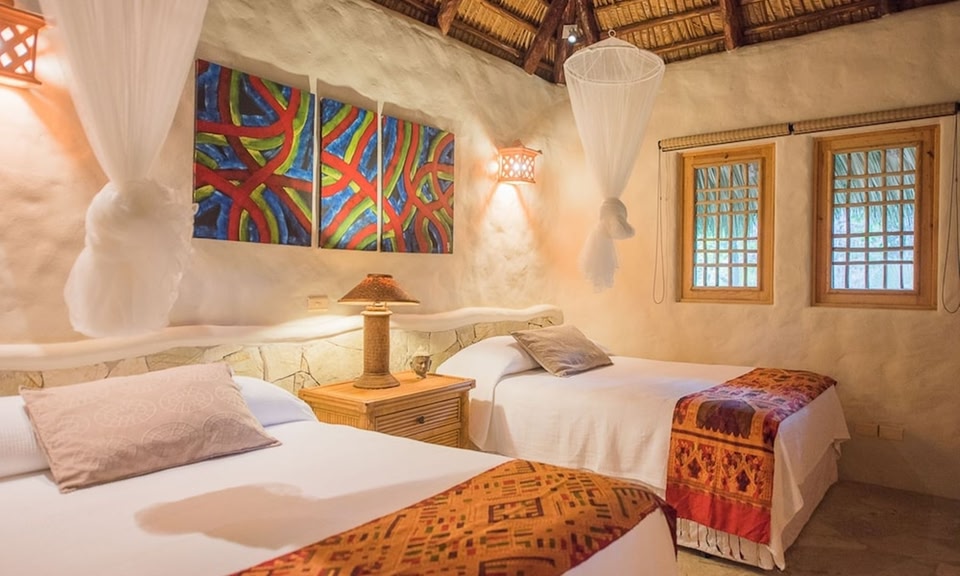 With natural stone walls and high thatched roofs, these private bungalows are on the coast of the Caribbean Ocean. The property features a yoga studio and a full-service spa.