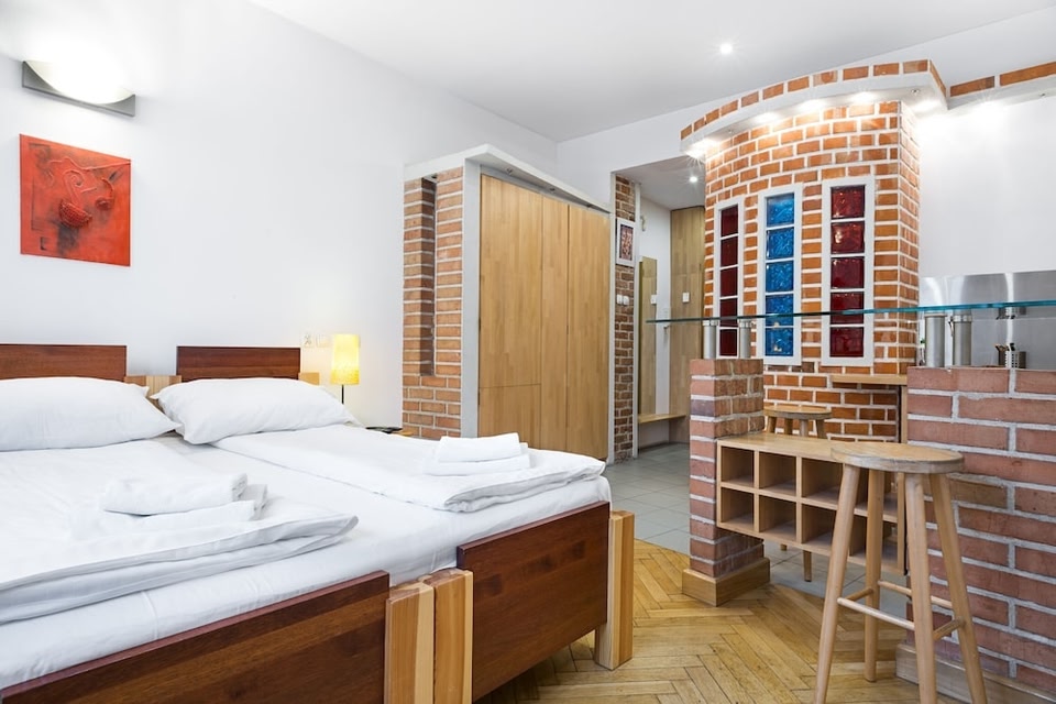 A 15-minute walk from Kraków’s Main Station and the historic Old Town, these studios each feature red brick interiors, free Wi-Fi and a well-equipped kitchenette. There are many restaurants and bars near Krowoderska Apartments.